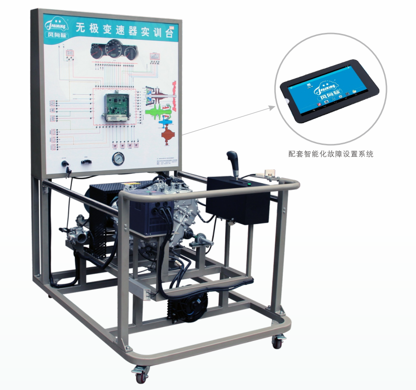 檢測控制面板,組合儀表,發(fā)動機無級變速器控制電腦(FCU)診斷座, 點火開關,電控無級變速器總成,節(jié)氣門總成,曲軸傳感器及信號盤,變速器檔桿總成,變速器油散熱裝置,三相異步電動機,變頻器,智能化故障設置和考核系統(tǒng),移動臺架(帶自鎖腳輪裝置)。