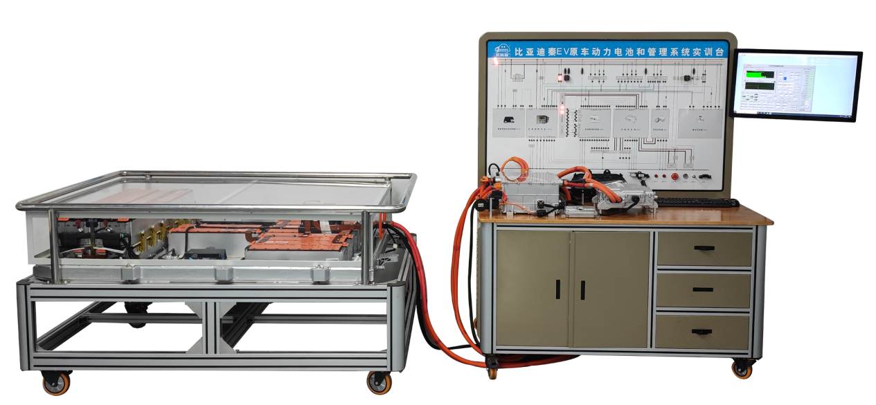 選用比亞迪秦EV-2019款原車三元鋰動力電池系統(tǒng)獨立運行,動力電池包總?cè)萘?/span>408.8V130AH(約53.1度電),共112節(jié)單體電池串聯(lián)而成;采用分布式電池管理系統(tǒng),由1個電池管理控制器(BMC)和多個電池信息采集器(BIC)及1套動力電池采樣線組成;動力電池采用電池夜冷和PTC加熱系統(tǒng)調(diào)節(jié)溫度;透明改裝,既利于認識電池結(jié)構(gòu),同時嚴禁接觸,保證安全學(xué)習(xí);低壓控制線和高壓動力線均為原車件,長度增加,高壓動力線為橙色,外加保護波紋管,連接處加警示標(biāo)識,上電狀況下嚴禁插拔任何高壓動力線;使學(xué)員盡快認識動力電池零部件組成和連接關(guān)系。適用于中高等職業(yè)技術(shù)院校和培訓(xùn)機構(gòu)對動力電池系統(tǒng)原理和維修實訓(xùn)的教學(xué)需要。