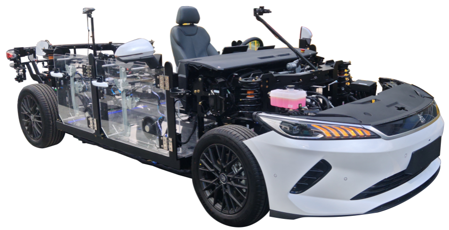 選用比亞迪秦PLUS-EV智駕版車輛制做在不改變原始汽車主體布局的情況下對其進行深度改裝,并且所有車身外罩均被拆除;在不改變原始汽車主體布局的情況下對其進行深度改裝,并且所有車身外罩均被拆除;該產(chǎn)品的主體是原車部件,是基于對整車零部件的認知設(shè)計而成,清晰的展示純電動轎車的核心結(jié)構(gòu);真實的展示了動力域控制器(含DC/DC轉(zhuǎn)換器、車載充電器OBC、電池管理器BMS、高壓配電箱PDU、整車控制器VCU、電機控制器等),電池總成系統(tǒng),后車身控制系統(tǒng),左車身控制系統(tǒng),右車身控制系統(tǒng),檔位控制器,組合儀表,交流充電口,直流充電口,散熱風(fēng)扇,冷卻水箱,電動壓縮機,PTC加熱模塊,空調(diào)蒸發(fā)箱,空調(diào)熱管理集成模塊,前懸架減震,后橋減震,車輪,轉(zhuǎn)向管柱,齒輪齒條式方向機,電動助力轉(zhuǎn)向器,電動助力控制模塊,前后燈光系統(tǒng),門鎖系統(tǒng),車窗系統(tǒng),倒車?yán)走_及影像系統(tǒng)主要零部件的布局;形象的表達了純電動三電系統(tǒng)的結(jié)構(gòu)組成與工作原理充分展示出汽車各個零部件的全方位角度;